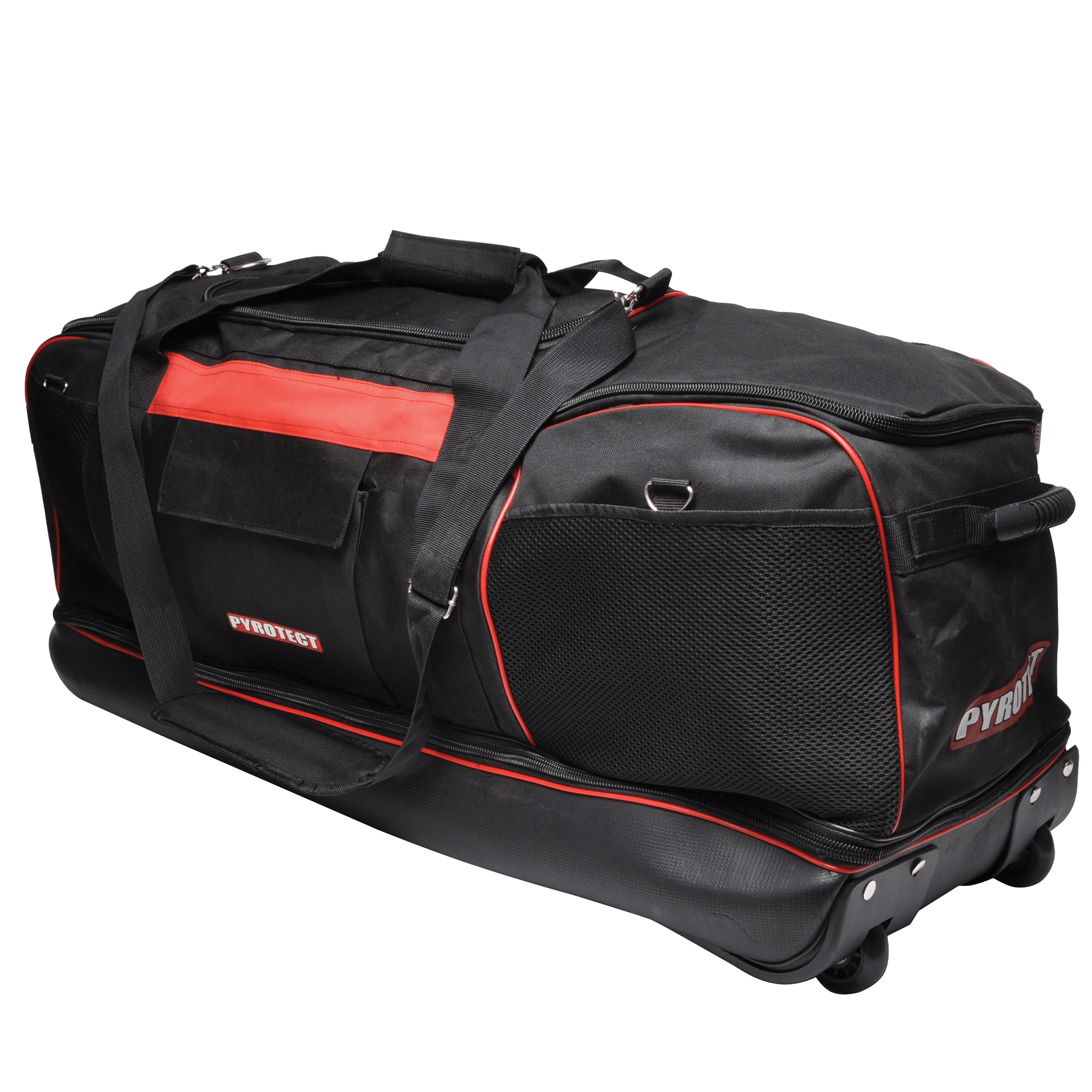 Pyrotect’s state-of-the-art multi-compartment equipment bags are comprised of high-quality tenacious double-layer Nylon material that provides impervious protection and sufficient water-resistance. The large center compartment has the capability to hold one full set of Pyrotect’s safety equipment and one full face helmet; additionally, the inclusion of several unique “Hygienic-Style” compartments and pockets are strategically located, while the largest “Hygienic-Style” compartment located on the bottom features an inner pocket for dirty clothing to be stored and provides space for packing several days worth of clean clothing, while the dual-sized “Hygienic-Style” pockets on top feature a compact pocket for dirty innerwear and socks, and a mid-size pocket for shoes to isolate odors. Furthermore, we increased holding capacity another 25% with the addition of three pockets on one side featuring a velcro-sealed tool pocket in the center, and two different sized mesh pockets for easy and quick access, while the other side features a mid-sized zip-up compartment and a mesh water bottle style pocket. Additionally, the bags are equipped with three convenient options for various carrying styles, which includes the standard dual strap handle that can be combined with a velcro-attached wrap for improved single-hand grip, a rubber handle at the front of the bag or a hidden pull-out metal handle located inside a zip-up pocket at the front to be used with the high-quality urethane wheels at the rear.