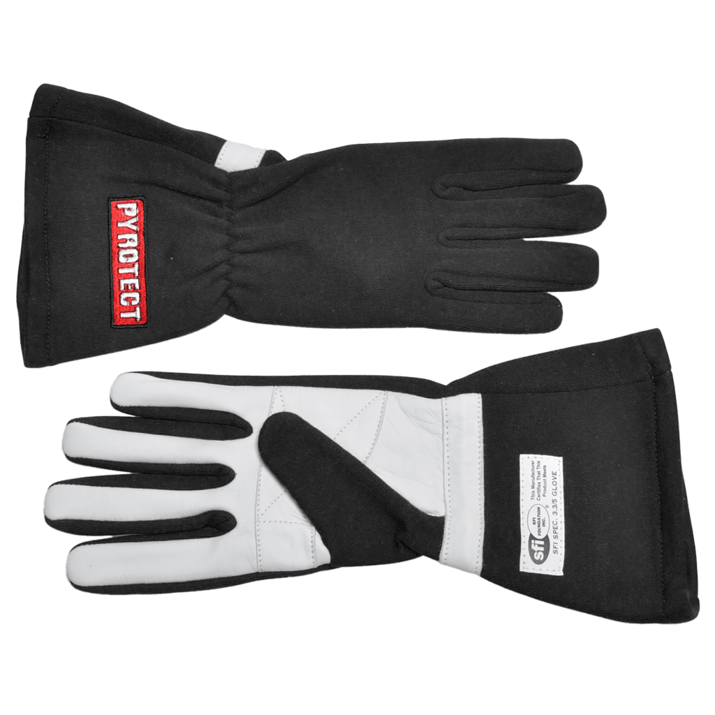 The Pyrotect Sport SFI-5 gloves feature fire resistant high-quality NOMEX and a straight-cut mid-length gauntlet with elastic around the wrist for a comfortable solid fit. Additionally, we incorporated high strength leather on the palm and fingers for excellent tactile function which results in positive feedback that lets you feel the wheel for improved driving without pressure points.